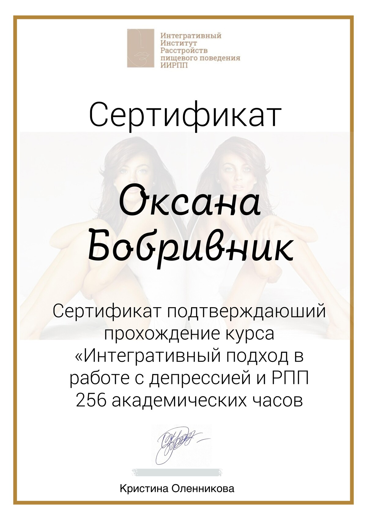 — Диплом МГУ им.М.В.Ломоносова — факультет психологии («Современные подходы к терапии и психокоррекции расстройств пищевого поведения» (РПП));
